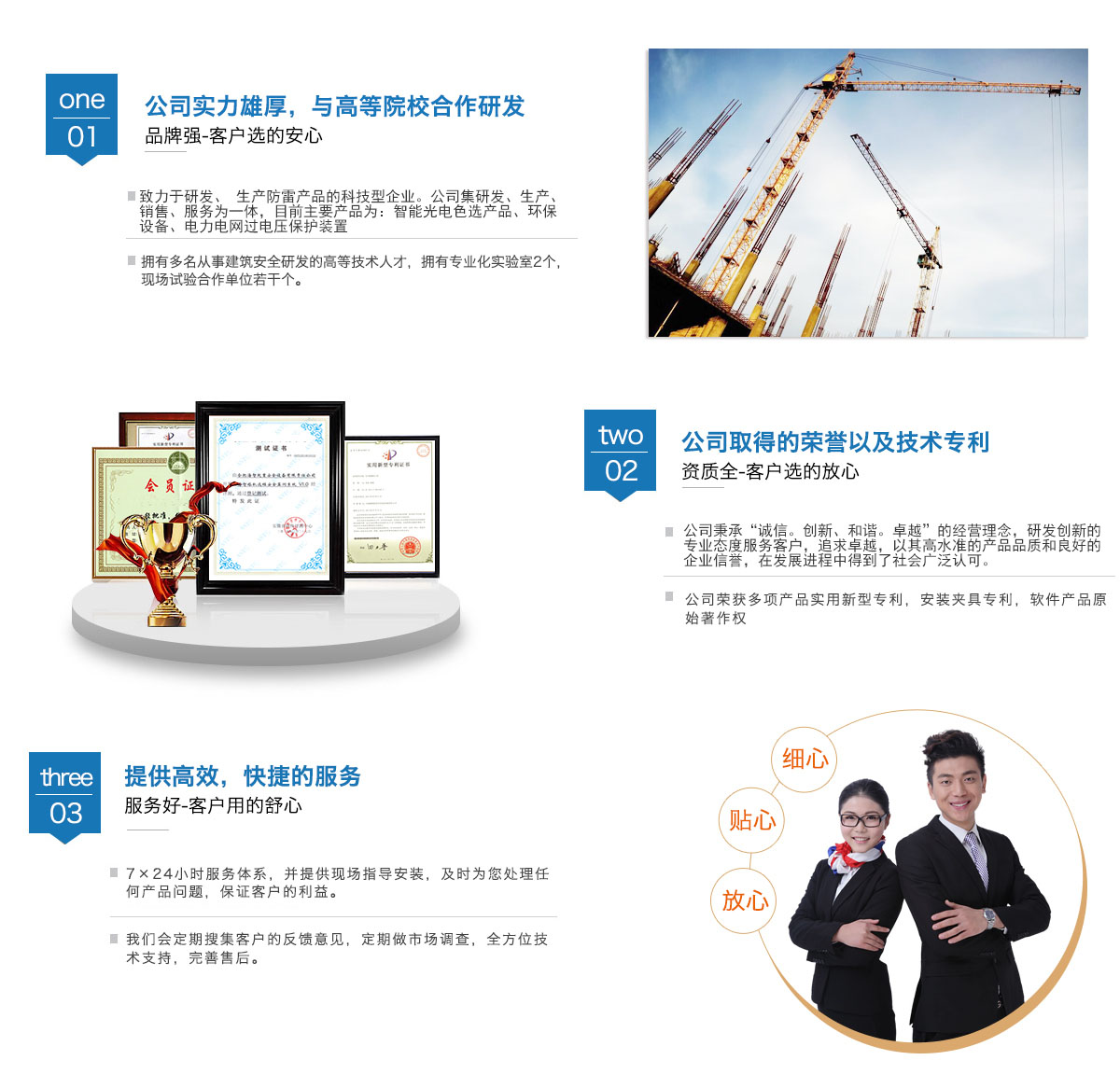 南京通和電氣科技有限公司是致力于研發(fā)、 生產(chǎn)防雷產(chǎn)品的科技型企業(yè)。公司集研發(fā)、生產(chǎn)、銷(xiāo)售、服務(wù)為一體,目前主要產(chǎn)品為:智能光電色選產(chǎn)品、環(huán)保設(shè)備、電力電網(wǎng)過(guò)電壓保護(hù)裝置。電力成套設(shè)備。光電產(chǎn)品、電力監(jiān)測(cè)設(shè)備等。公司秉承“誠(chéng)信。創(chuàng)新、和諧。卓越”的經(jīng)營(yíng)理念,研發(fā)創(chuàng)新的專(zhuān)業(yè)態(tài)度服務(wù)客戶,追求卓越,以其高水準(zhǔn)的產(chǎn)品品質(zhì)和良好的企業(yè)信譽(yù),在發(fā)展進(jìn)程中得到了社會(huì)廣泛認(rèn)可。